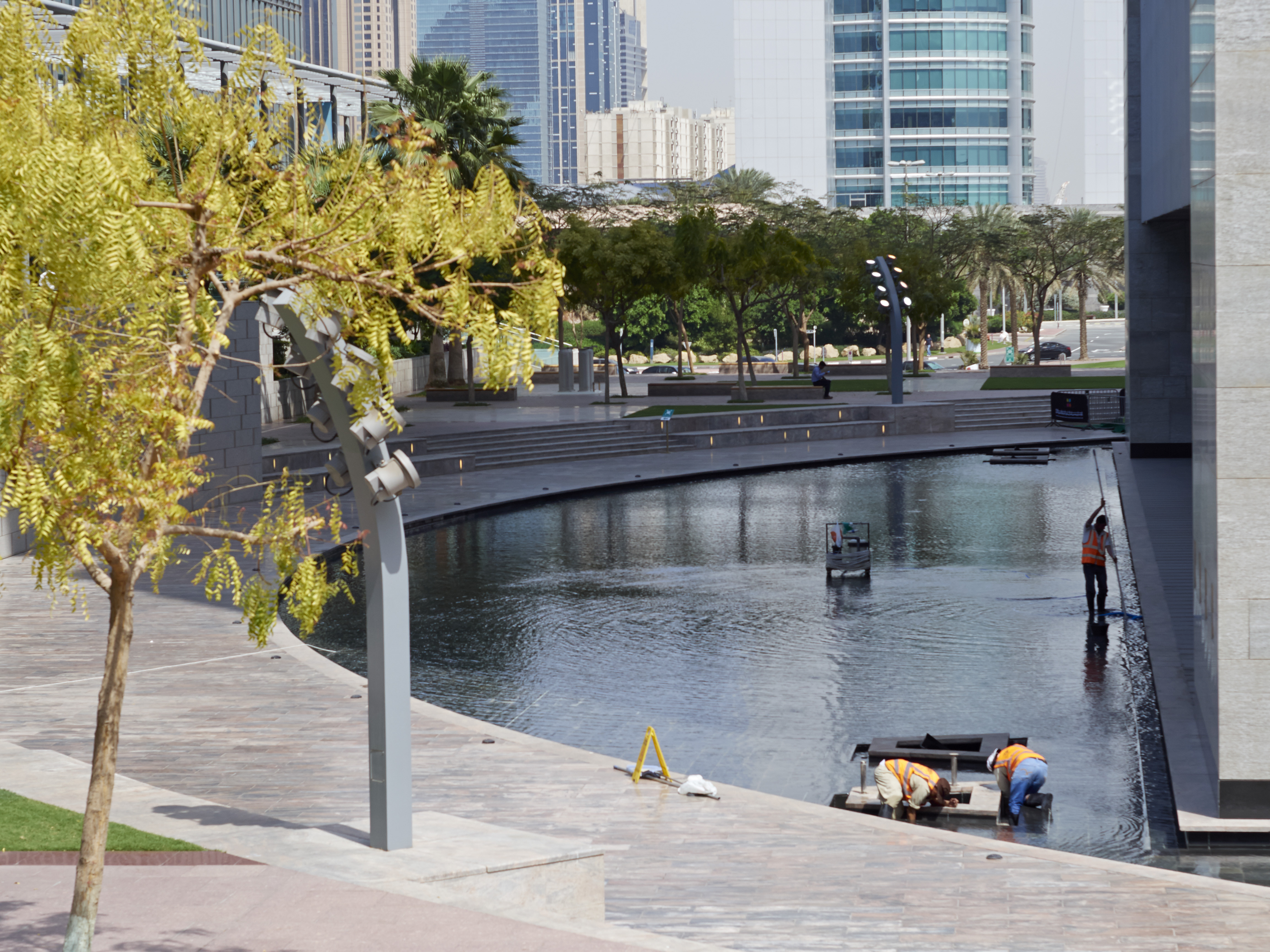 Moving outside to the mezzanine area I was impressed with how clean and well manicured the area was. I decided to look for my social context shot. There was quite a bit of maintenance going on so I tried a shot of some lawn work being done by foreign workers, but while I liked the shot, it was a bit week as commentary. I changed up a little when I saw a maintenance cart in the middle of a reflecting pool, and I couldn’t resist – it looked like someone was working on the water itself.