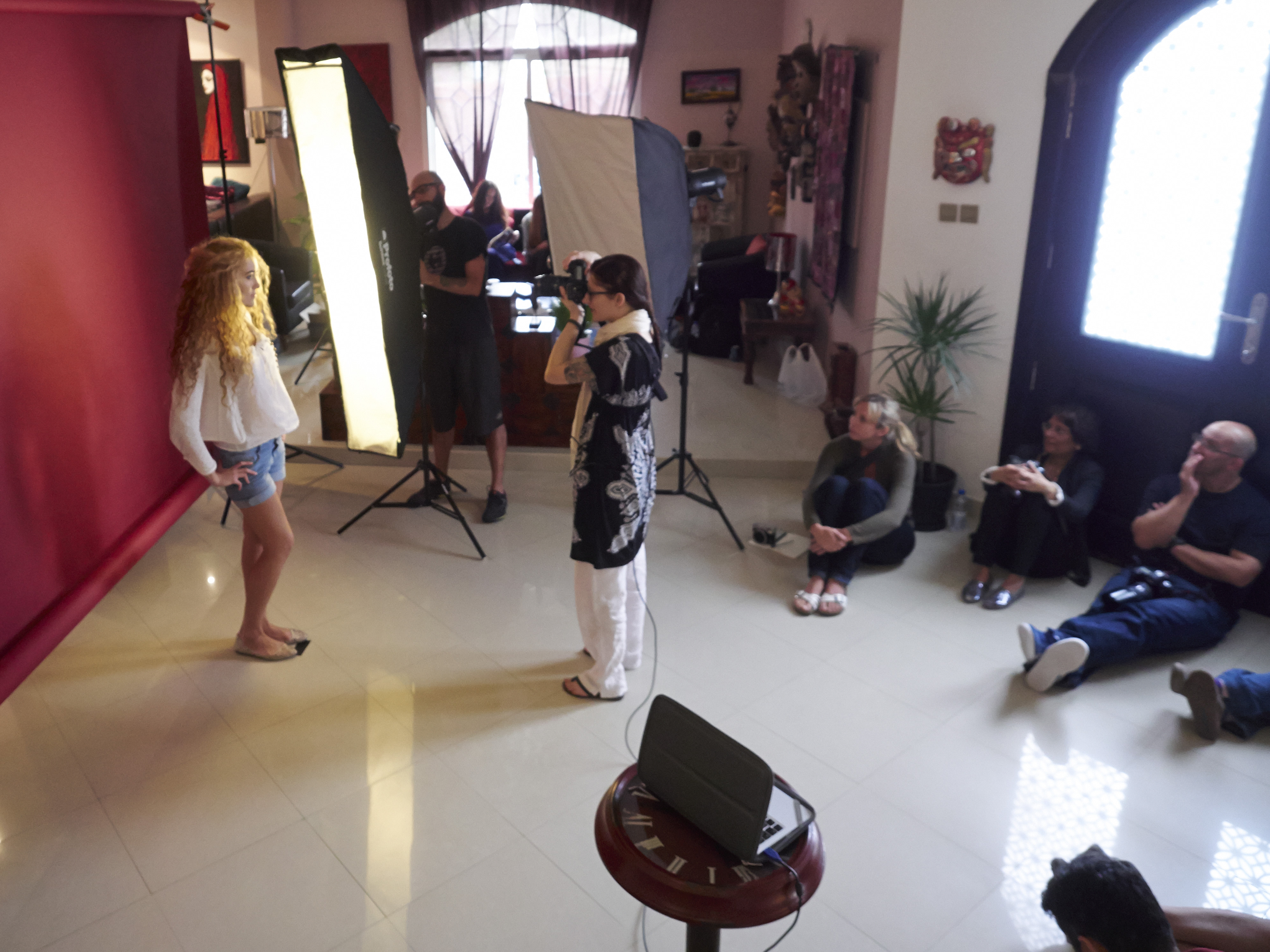 Next we went on location to GPP staffer Dawn’s house to watch Sara work through the process. Starting inside she showed us the effects of different light setups working while tethered. Using three different models she set up lighting and angles that suited them, shot some images and critiqued the results with us real time. It was a very informative session. Soon the pool was heated up and we headed outside to watch the shot Sara had planned on come together.