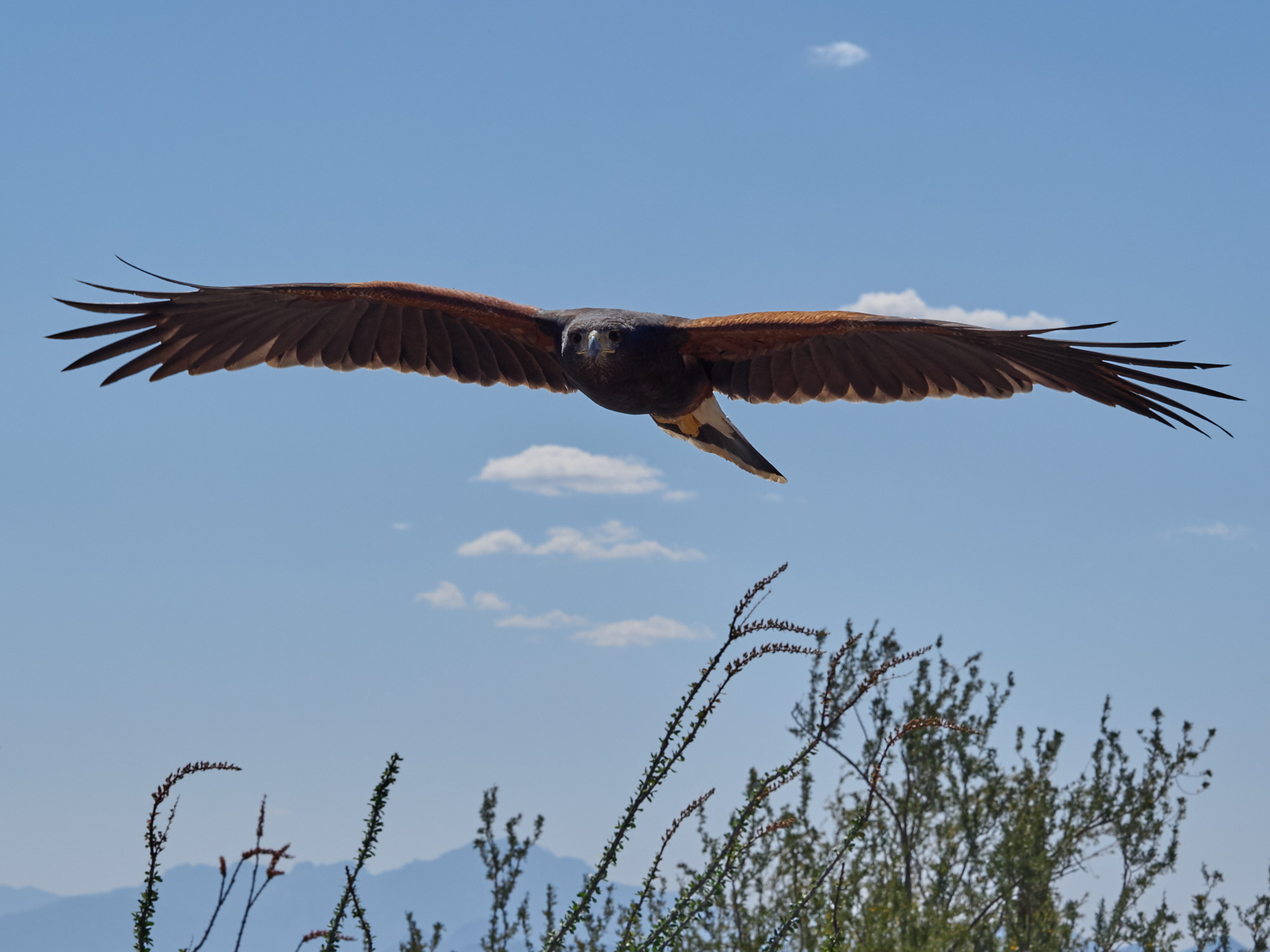 While these birds are close enough to get a really good shot, it can be tricky since they’re so fast. The Harris Hawks tended to soar which made it easier to get them in flight than birds like the Peregrine Falcon, which has been clocked at 240mph in a dive. They are quick!
