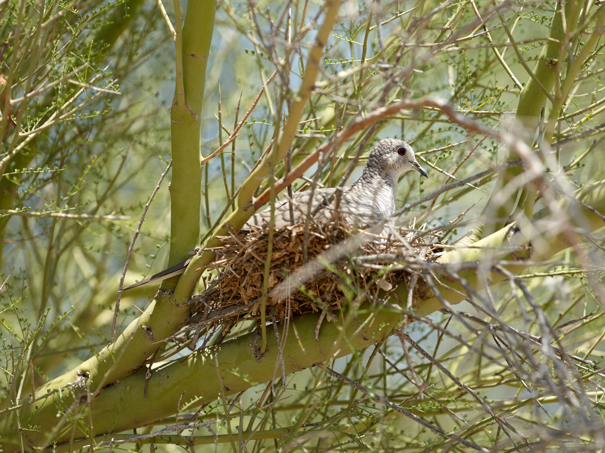We noticed a couple of nests being build in the tree the hummingbirds hang out at, and this one just above eye level is currently occupied by mama, one chick and an unhatched egg. There is a balancing act in getting close enough for a decent picture while not stressing her out. Fortunately she’s somewhat accustomed to us so with a long lens it’s just possible to catch a good angle.